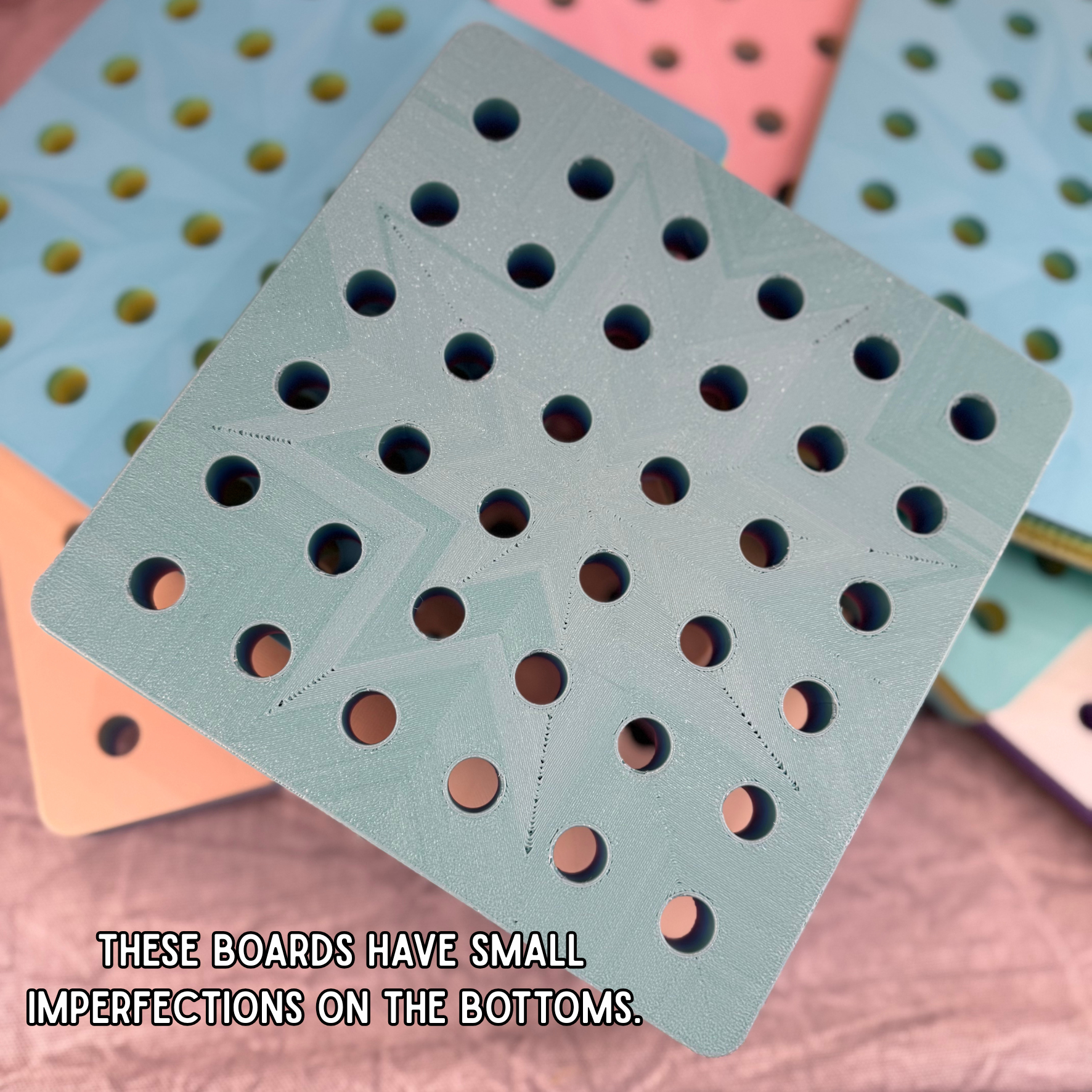 Sometimes there are small imperfections on the bottom of the boards but this does not effect if usefulness. I am always learning how to improve my printers calibration settings and striving to make them perfect in the future.