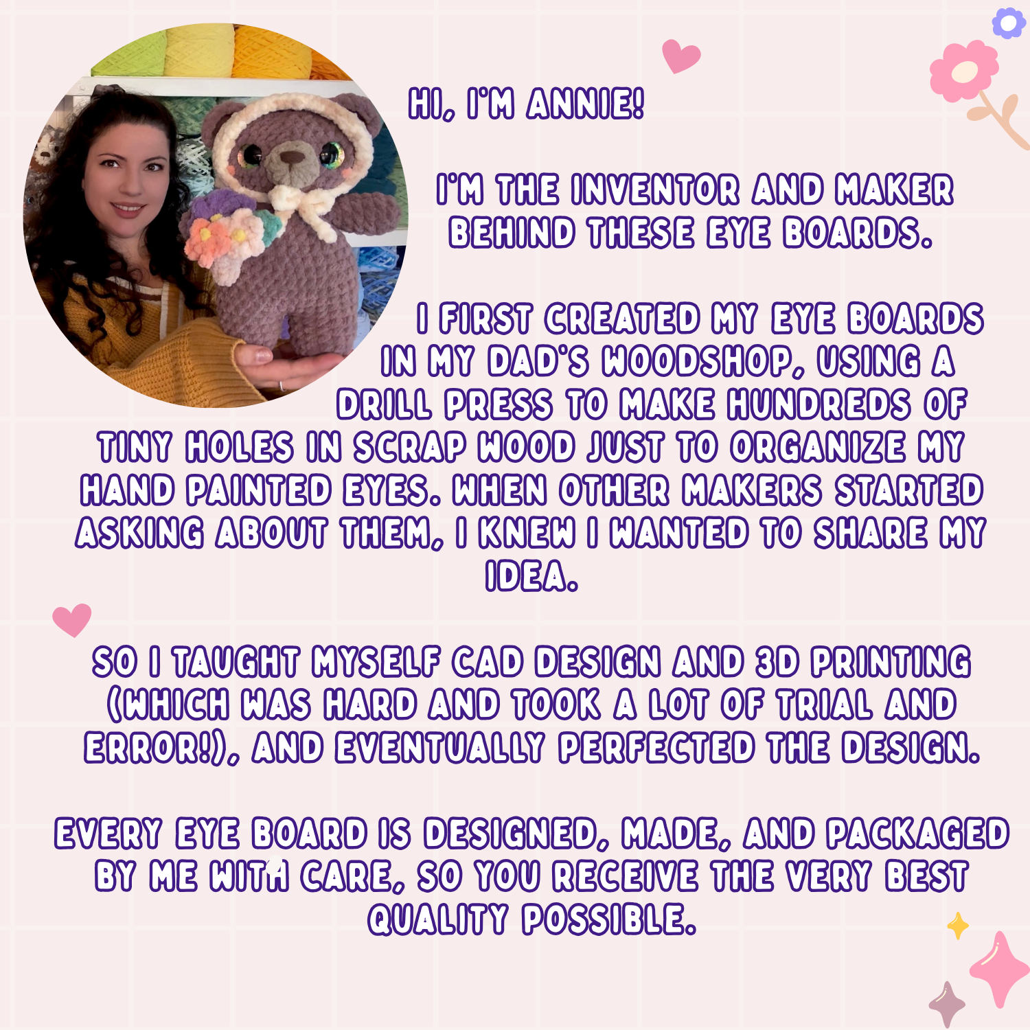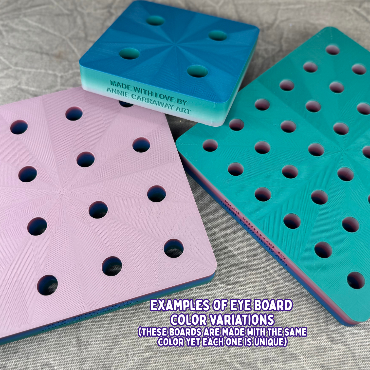 I initially invented these Eye Boards by using a drill press in the father's wood shop to create holes in scrap pieces of wood so I could display my hand painted eyes. Sadly, I do not have my own wood shop but I do have a 3D printer and the motivation to learn 3D design! I have spent months testing designs and printing settings to create these eye boards and I am so happy with them (they have a lot less splinters than my original versions too lol)