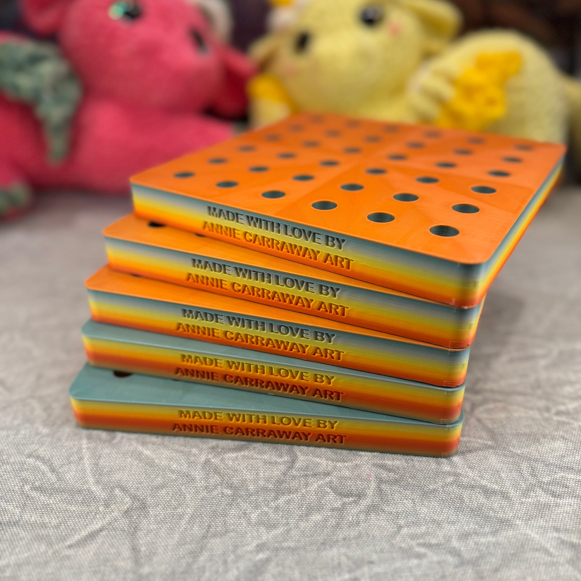 I initially invented these Eye Boards by using a drill press in the father's wood shop to create holes in scrap pieces of wood so I could display my hand painted eyes. Sadly, I do not have my own wood shop but I do have a 3D printer and the motivation to learn 3D design! I have spent months testing designs and printing settings to create these eye boards and I am so happy with them (they have a lot less splinters than my original versions too lol)
